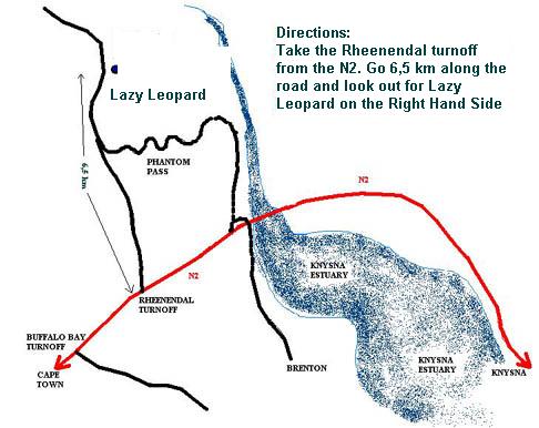 From the N2 take the Rheenendal turnoff. Drive for 6 km. You will find the Lazy Leopard sign on your right. Go through the entrance and follow the signs to the reception. Should there be no-one at reception, please call
