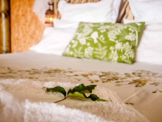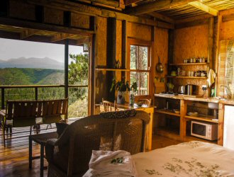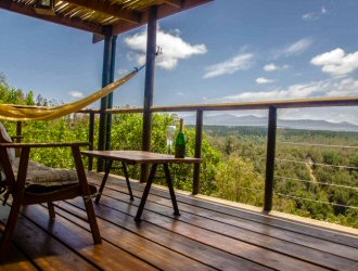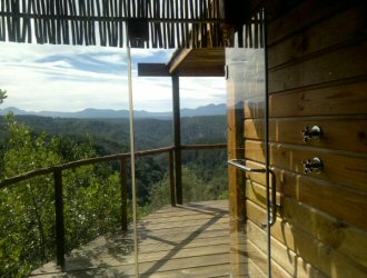 The shower at Starry Forest is surrounded by glass and opens onto the sunny deck that has an outdoor bath. Come lose yourself or rather find yourself or just relax in a place with a view forever and no-one in sight.